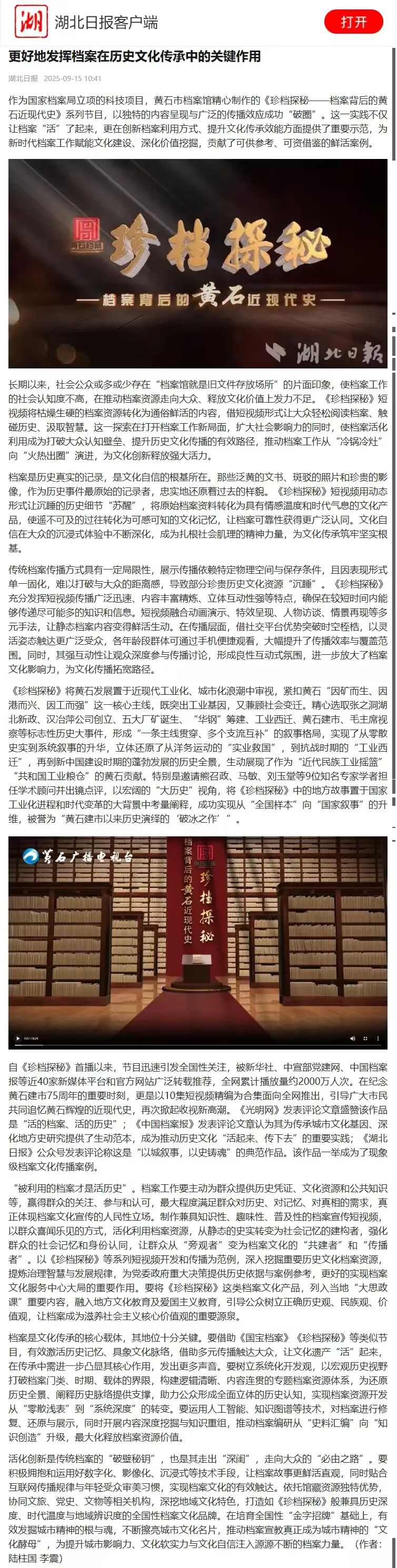 作为国家档案局立项的科技项目,黄石市档案馆精心制作的《珍档探秘——档案背后的黄石近现代史》系列节目,以独特的内容呈现与广泛的传播效应成功“破圈”。这一实践不仅让档案“活”了起来,更在创新档案利用方式、提升文化传承效能方面提供了重要示范,为新时代档案工作赋能文化建设、深化价值挖掘,贡献了可供参考、可资借鉴的鲜活案例。