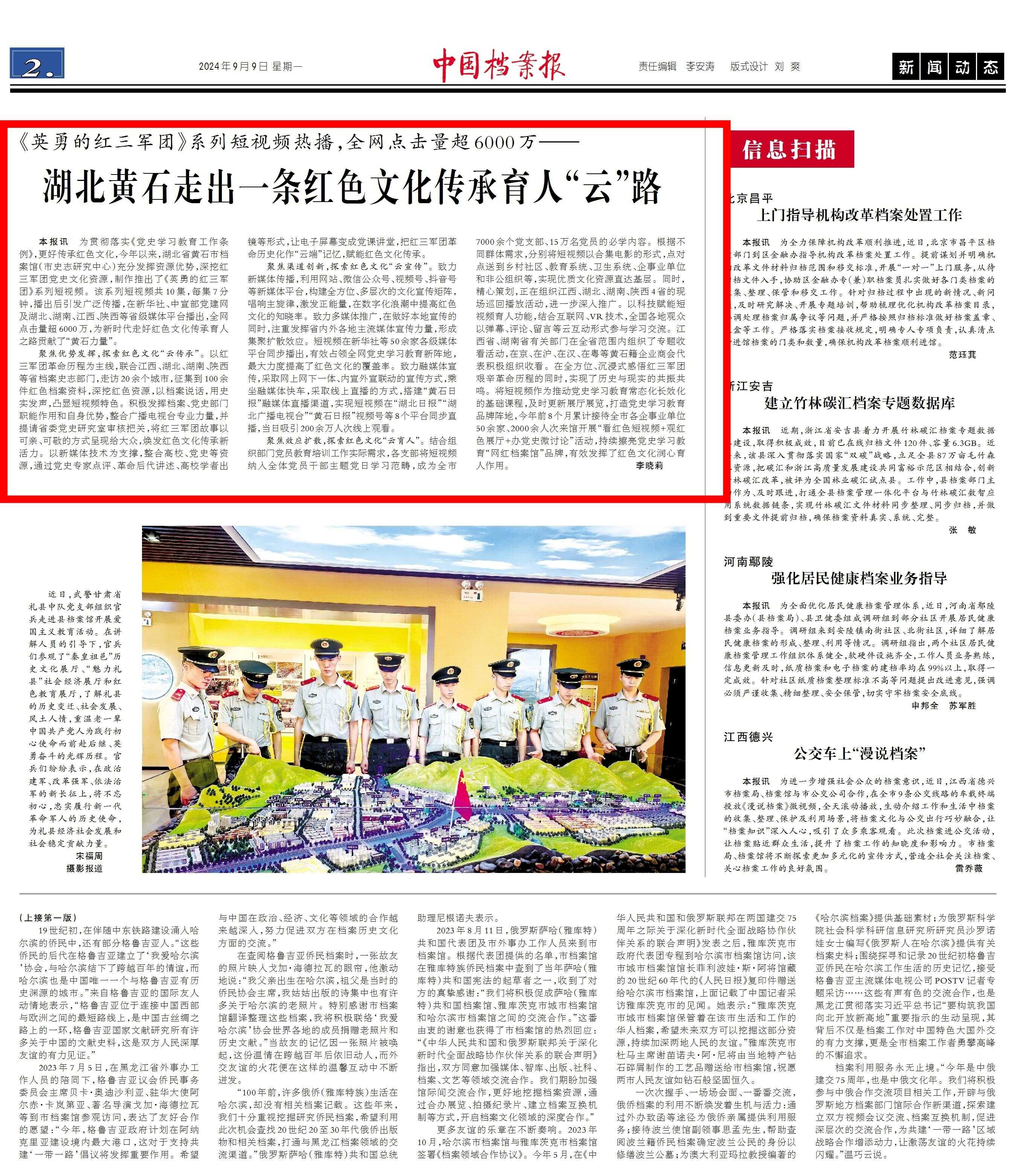 为贯彻落实《党史学习教育工作条例》,更好传承红色文化,今年以来,湖北省黄石市档案馆(市史志研究中心)充分发挥资源优势,深挖红三军团党史文化资源,制作推出了《英勇的红三军团》系列短视频。该系列短视频共10集,每集7分钟,播出后引发广泛传播,在新华社、中宣部党建网及湖北、湖南、江西、陕西等省级媒体平台播出,全网点击量超6000万,为新时代走好红色文化传承育人之路贡献了“黄石力量”。