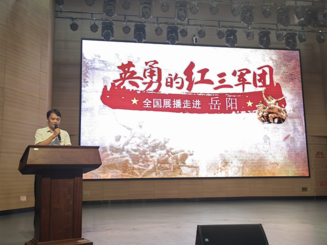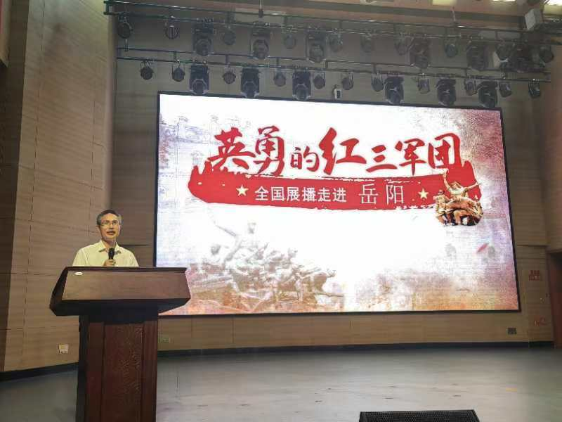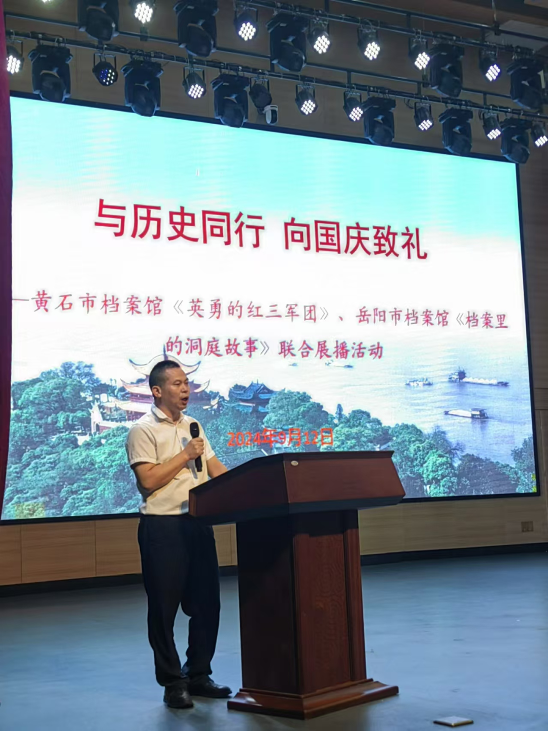 在全国上下深入学习贯彻党的二十届三中全会精神、喜迎新中国成立75周年之际,9月12日上午,“与历史同行 向国庆致礼”——黄石市档案馆《英勇的红三军团》、岳阳市档案馆《档案里的洞庭》联合展播活动在岳阳市图书馆一楼报告厅举行。活动由岳阳市档案馆、黄石市档案馆(市史志研究中心)联合主办。岳阳市档案馆党组书记、馆长余友安致辞,黄石市档案馆副馆长邓瑰代表黄石市档案馆发言。岳阳市档案馆、岳阳市图书馆、岳阳市委党史研究室、岳阳市委台办、岳阳市社科联、岳阳市烈士陵园等单位干部职工、各界社会组织代表、群众共200余人参加活动。