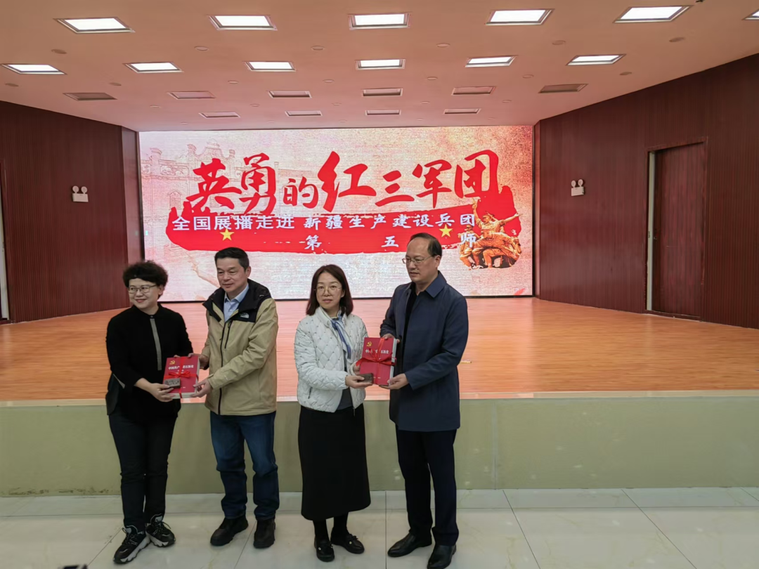 观影开始前,参与活动的五师干部和师生代表参观了黄石市档案馆展出的红色珍品档案展。活动现场,郭卫东、陆柱国代表黄石市档案局、黄石市档案馆,分别向第五师党委党史研究室、第五师档案馆赠送了《中国共产党黄石历史》(第一、二卷)及《英勇的红三军团》视频合集U盘;李玲君、徐华汉代表第五师党委党史研究室、第五师党委组织部向黄石市考察团赠送了《五师军垦记忆(1950—1975)》和第五师精品党课《同走边防路 传承戍边情》视频U盘。