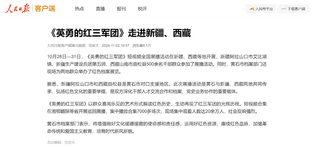 《英勇的红三军团》以群众喜闻乐见的艺术形式解读红色历史,生动再现了红三军团的光辉历程。短视频合集在湘鄂赣陕等省开展巡回展播,集中播放合集7000多场次,现场集中观看人数达20余万人,社会反响强烈。