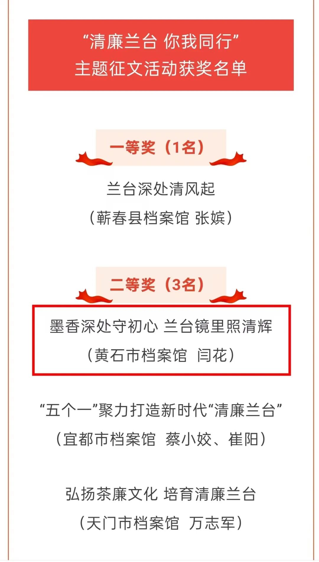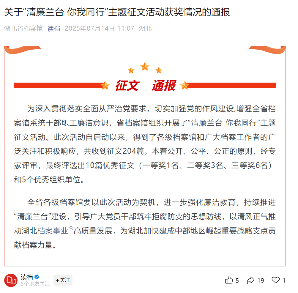此次获奖是对黄石市档案馆工作成效的充分肯定,市档案馆将以此次获奖为契机,进一步强化廉洁教育,持续推进“清廉兰台”建设走深走实,以档案系统的清风正气助推全市档案事业高质量发展,为加快建成武汉都市圈重要增长极、服务推动全省支点建设贡献档案力量。