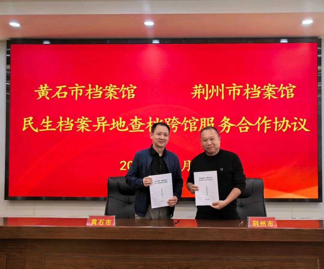 黄石市档案馆和荆州市档案馆签订了《民生档案异地查档跨馆服务合作协议》,并互赠了档案文化书籍。