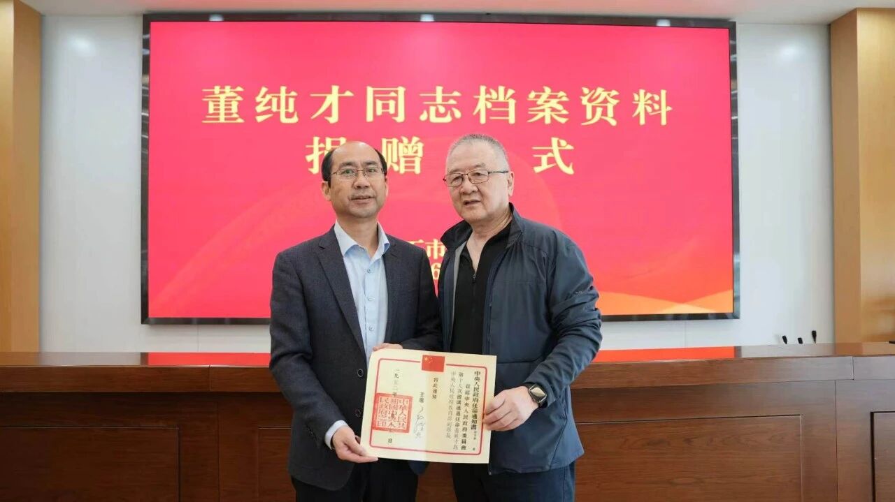 4月7日,著名教育家、科普作家董纯才同志珍贵档案资料,正式入藏黄石市档案馆。董纯才同志长子董万万先生、侄孙女董梅女士等一行,专程从北京回到黄石捐赠档案,市档案馆馆长贾方军颁发了捐赠证书。