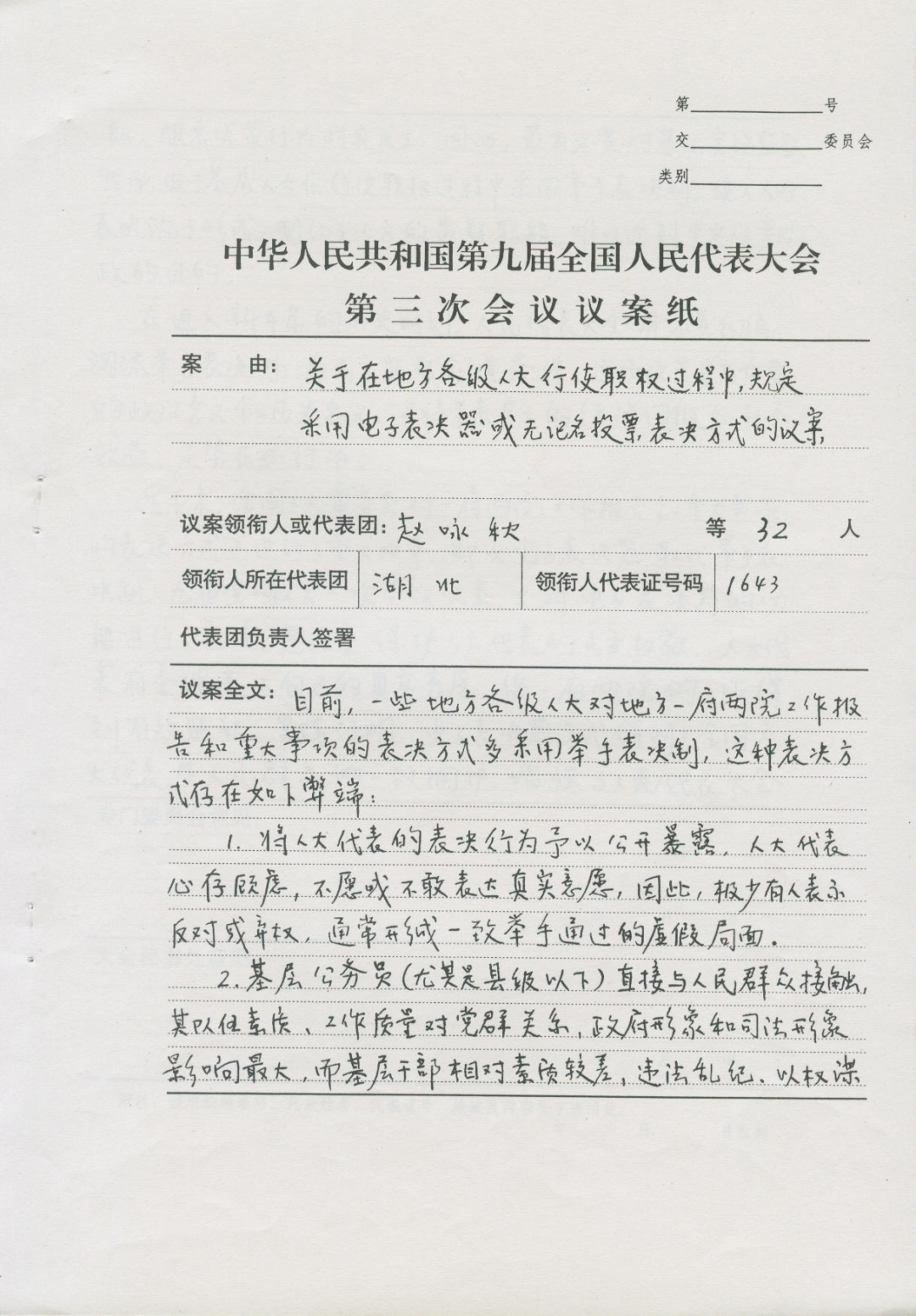 2000年3月,北京市湖北大厦,湖北代表团第二小组讨论会场里,大家正在传阅着我牵头起草的《关于在地方各级人大行使职权过程中,规定采用电子表决器或无记名投票表决方式的议案》,我的这篇议案原文并不长,大意如下: