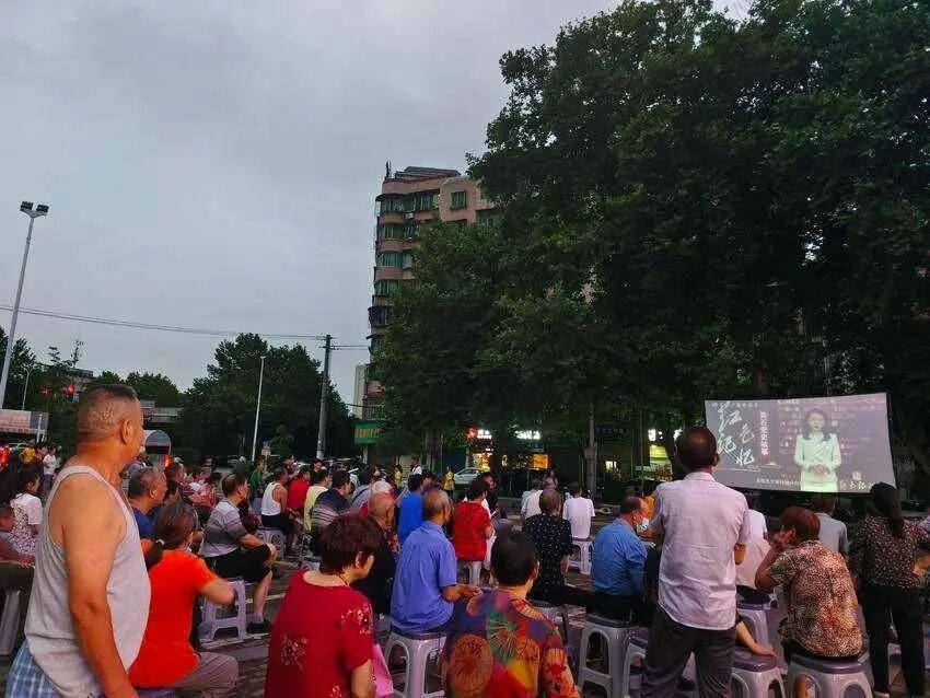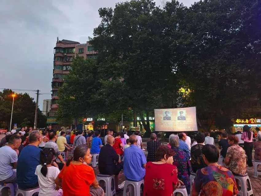 6月26日晚上,黄石市西塞山区石料山社区联合黄石市商务局,组织党员群众近百人在华联超市门口观看《红色记忆——黄石党史故事》系列短片。
