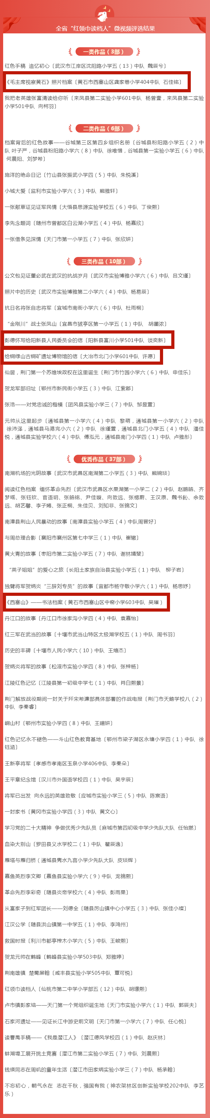 近日,省档案局、省档案馆、团省委、省少工委印发《关于全省“红领巾读档人”微视频评选结果的通报》,黄石市档案馆制作、报送的4个微视频全部获奖。其中,一类作品1个、三类作品2个、优秀作品1个。