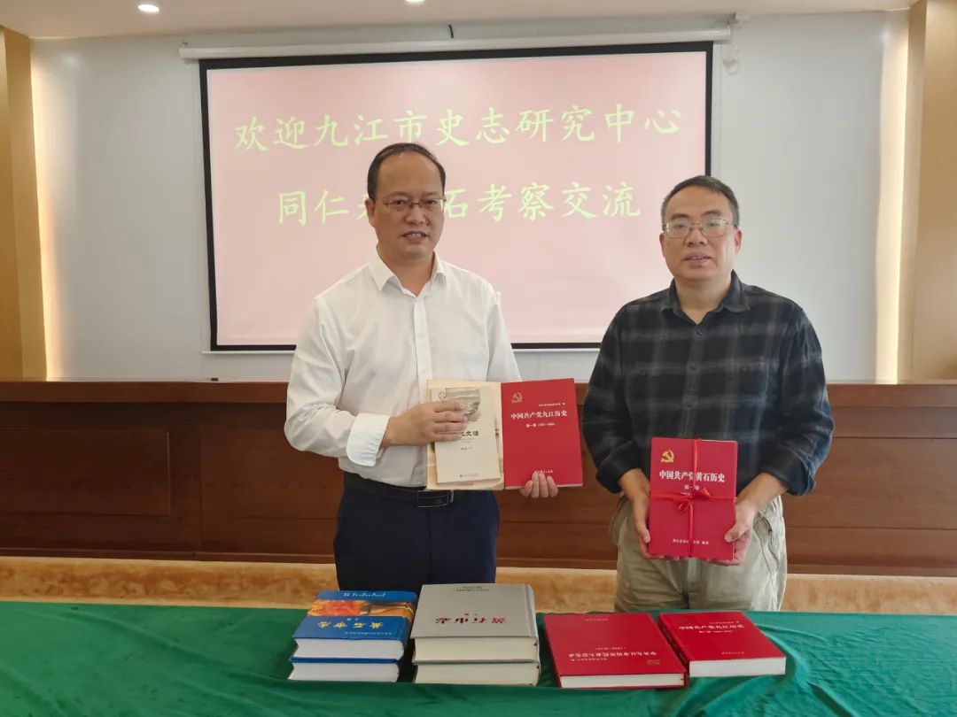 会上,黄石、九江史志部门双方还现场互相交换了《九江年鉴(2023)》《中国共产党九江历史》(第一卷)《黄石年鉴(2023)》《中国共产党黄石历史》(第一、二卷)《黄石市志》等史志书籍。