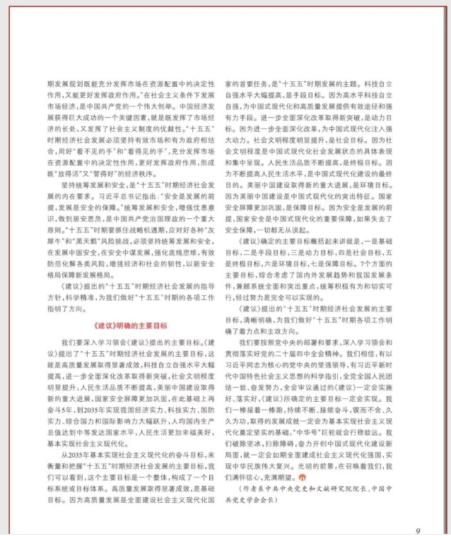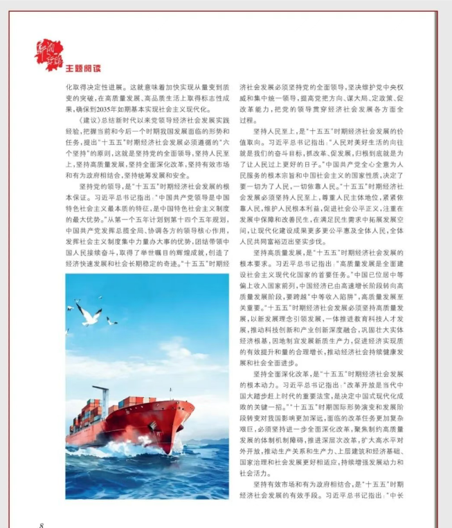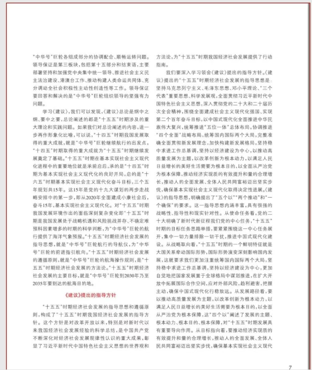 改革开放以来,我国的改革和发展取得举世瞩目的巨大成就。特别是新时代以来,党和国家事业取得历史性成就、发生历史性变革。制定中长期规划是我们党治国理政的重要方式。制定中长期规划并非中国所独有,也并不是中国首创,然而坚持接续编制和实施中长期规划则唯有中国。这也成为我们党在改革和发展中取得成功的重要法宝和制胜秘诀。我们经常说中国经济是一片大海,常常将中国的发展比喻为航行在大海中的“中华号”巨轮。如果将“十五五”时期作为中国基本实现社会主义现代化“夯实基础、全面发力”的关键时期和时间段,那么,我们可以说,“十五五”规划建议就是“中华号”巨轮从2026年至2030年的“航海图”。这是作一个形象化的比喻。