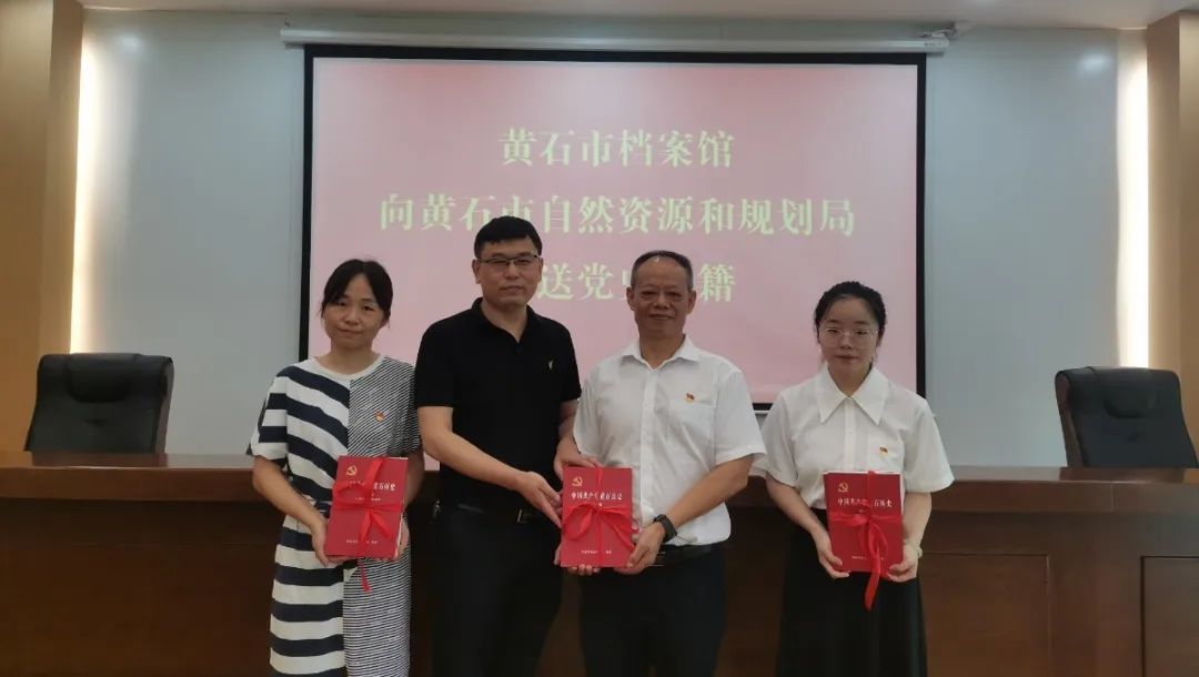 在市档案馆5楼会议室,市档案馆向市自然资源和规划局第五党支部、第六党支部、第七党支部等三个党支部分别赠送了市档案馆编撰的党史书籍《中国共产党黄石历史》(一、二卷),播放了市档案馆精心制作的《红色记忆——黄石党史故事》,弘扬伟大建党精神,汲取奋进力量。