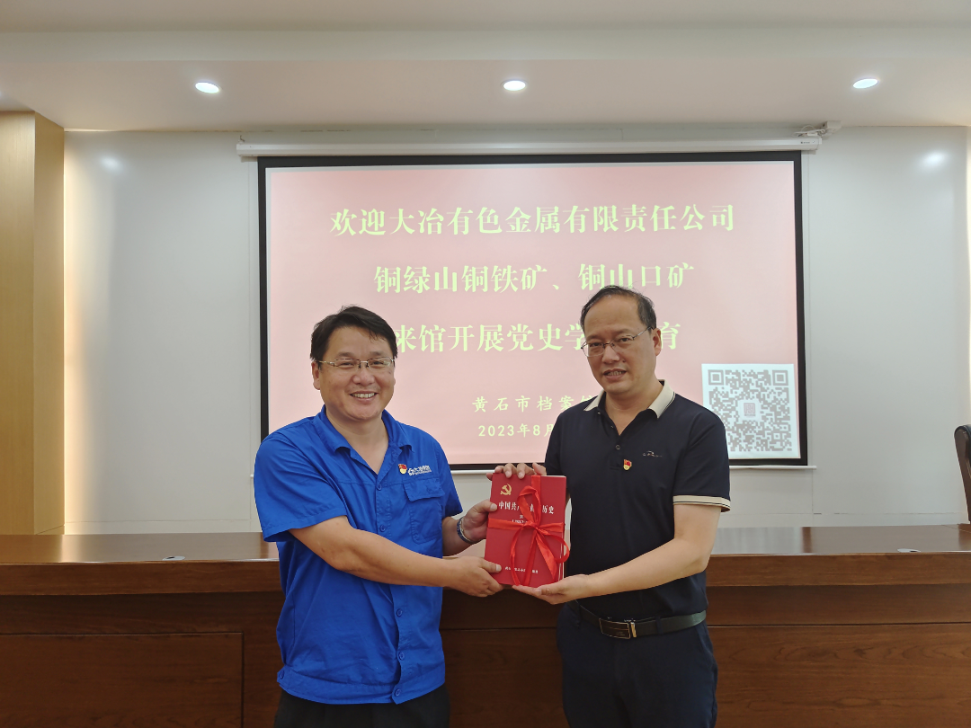 在市档案馆五楼会议室,市档案馆分别为大冶有色金属有限责任公司铜绿山铜铁矿和铜山口矿赠送了《中国共产党黄石历史》(第一、二卷),播放了市档案馆精心制作的《红色记忆——黄石党史故事》短视频,以红色文化涵养党性,以革命精神锤炼品格,教育引导铜绿山铜铁矿和铜山口矿干部职工旗帜鲜明讲政治,助推党史学习教育走实走深。