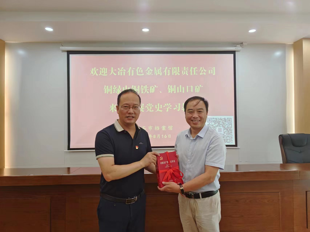 8月16日上午,大冶有色金属有限责任公司铜绿山铜铁矿党委书记、矿长郑能等矿领导带领铜绿山铜铁矿和铜山口矿一行共66人到市档案馆(市史志研究中心)开展党史学习教育。市档案馆馆长陆柱国陪同。
